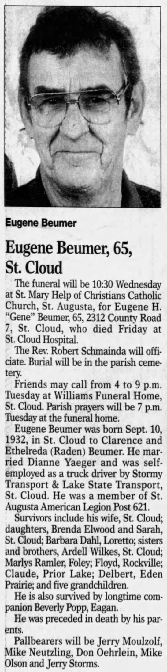 - 1950 Census - St. Augusta, Stearns Co, MN (Listed as Eugene, age 17, son of Clarence Beumer)