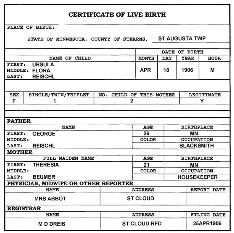 • 1920 Census - St. Cloud Township, Stearns Co, MN (Listed as Ursula, age 13, daughter of George Reischl)