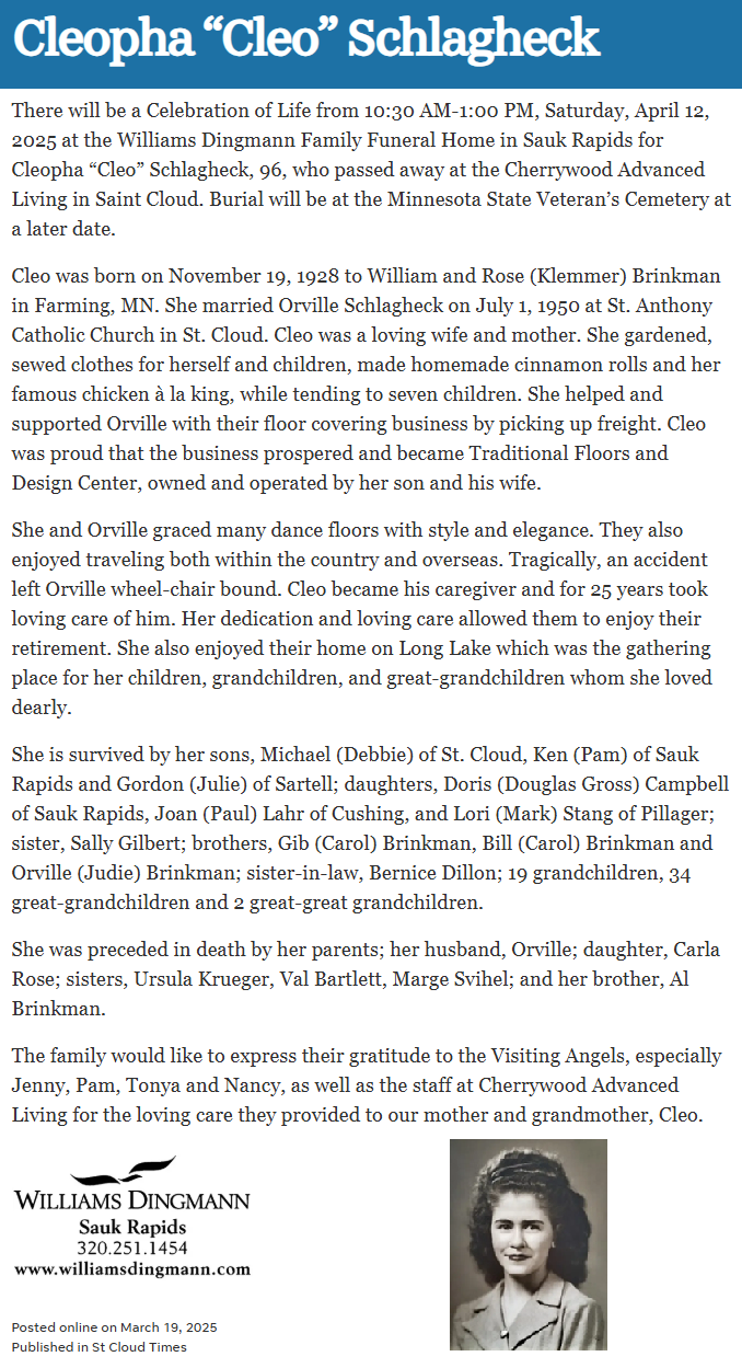 Orville married Cleopha Ann Brinkman on July 1, 1950 in St. Cloud, Stearns Co, MN.
