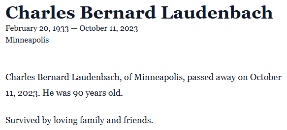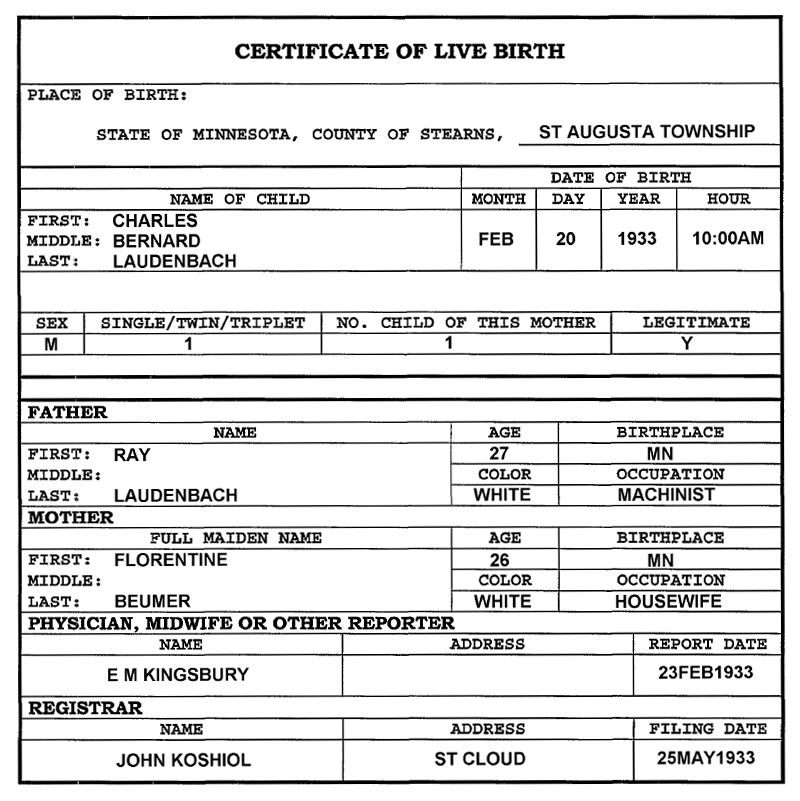 - 1940 Census - Cold Spring, Stearns Co, MN (Listed as Charles B., age 7, son of Raymond H. Laudenbach)