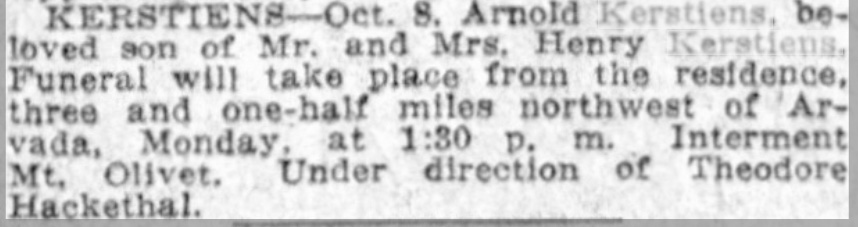 - 1920 Census - Grant Precinct 1, Jefferson Co, CO (Listed as Arnold, age 8/12, son of Henry F. Kerstiens)