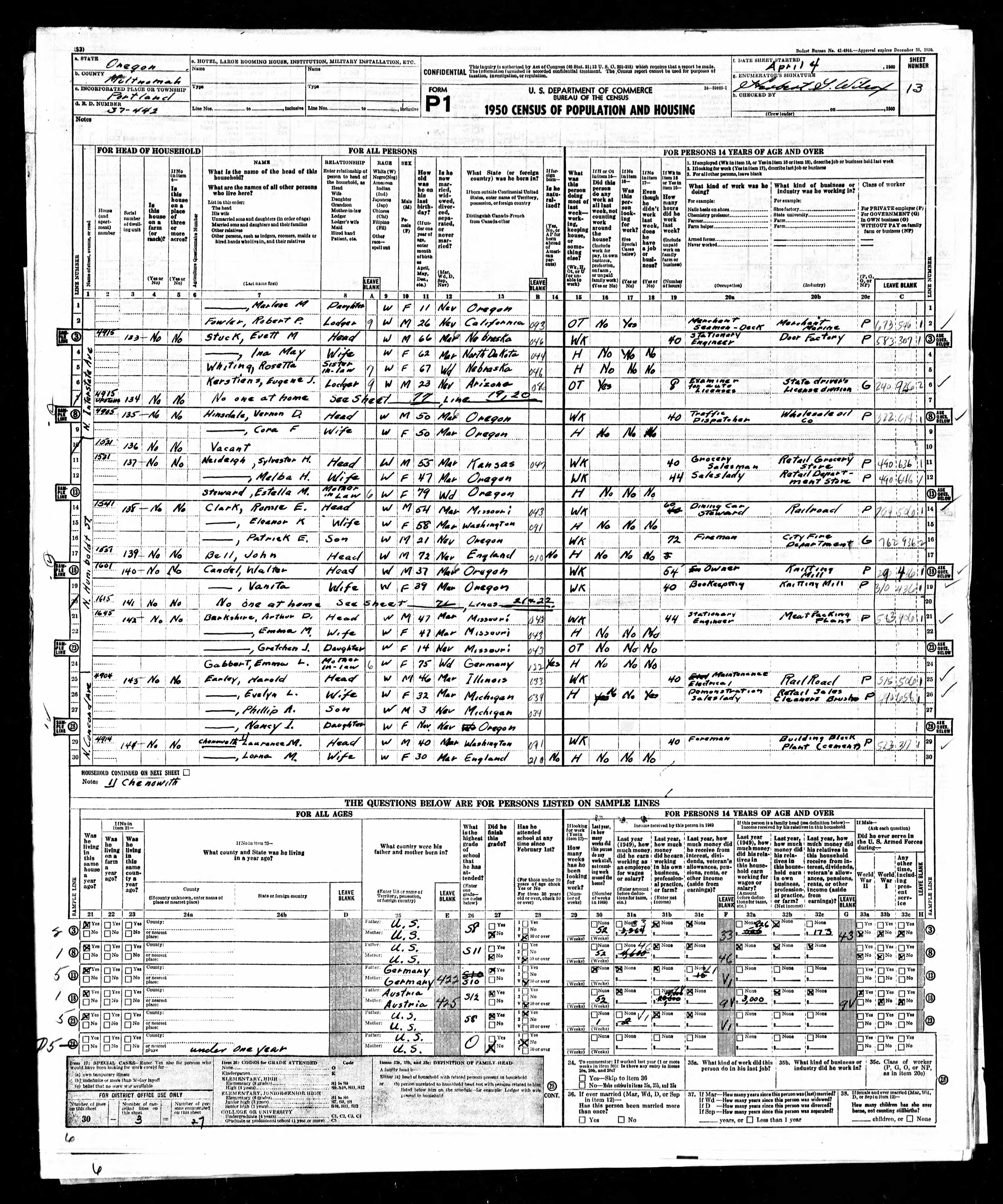 - 1950 Census - Portland, Multnomah Co, OR (Listed as Eugene J. Kerstiens, age 23, lodger of Evett M. Stuck)