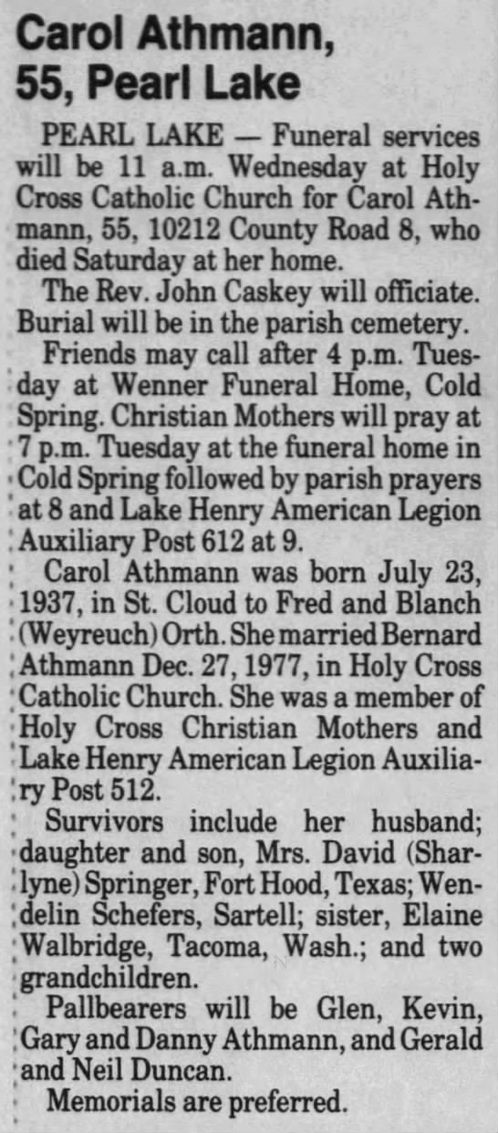 Carol married Bernard Hubert Athmann on December 27, 1977 in Marty, Stearns Co, MN.