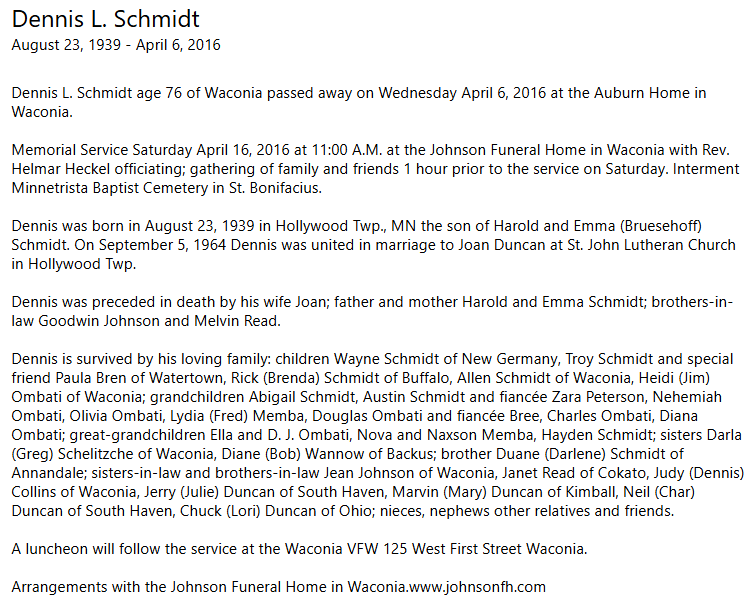 | Died: | April 6, 2016 in Waconia, Carver Co, MN. View Obituary |