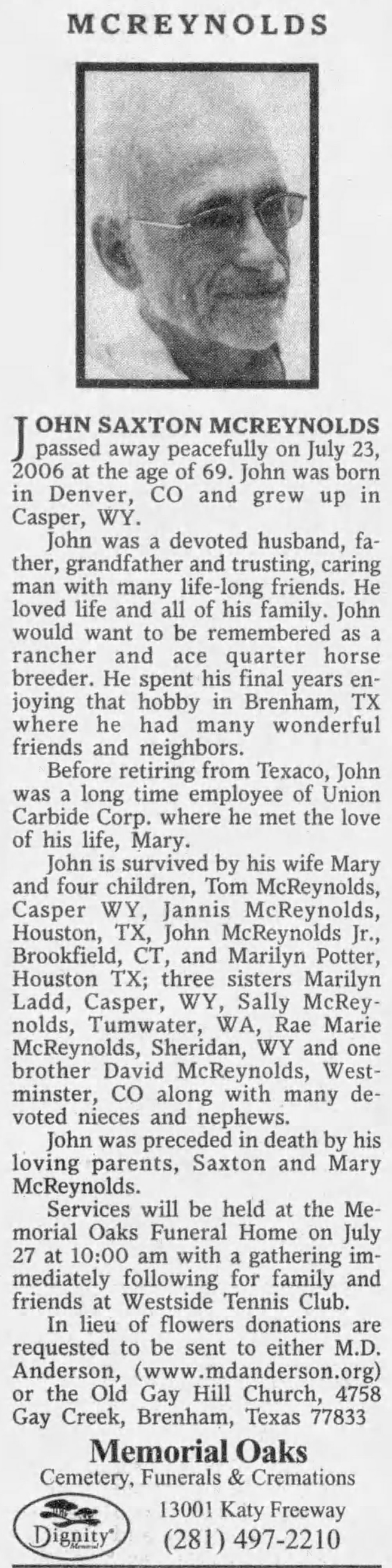- 1950 Census - Casper, Natrona Co, WY (Listed as John S., age 13, son of Saxton McReynolds)