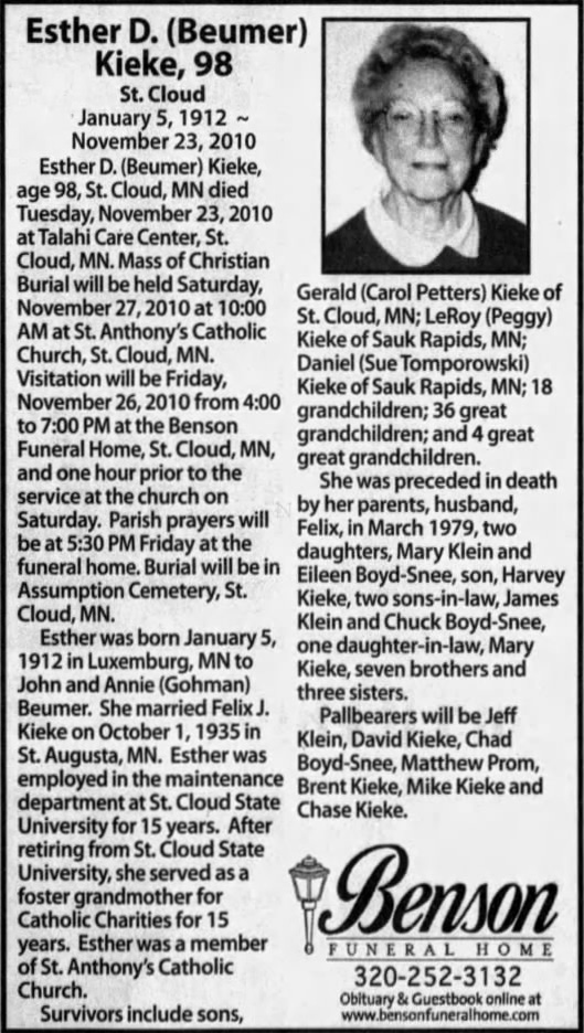 Esther married Felix Joseph Kieke on October 1, 1935 in St. Augusta, Stearns Co, MN.