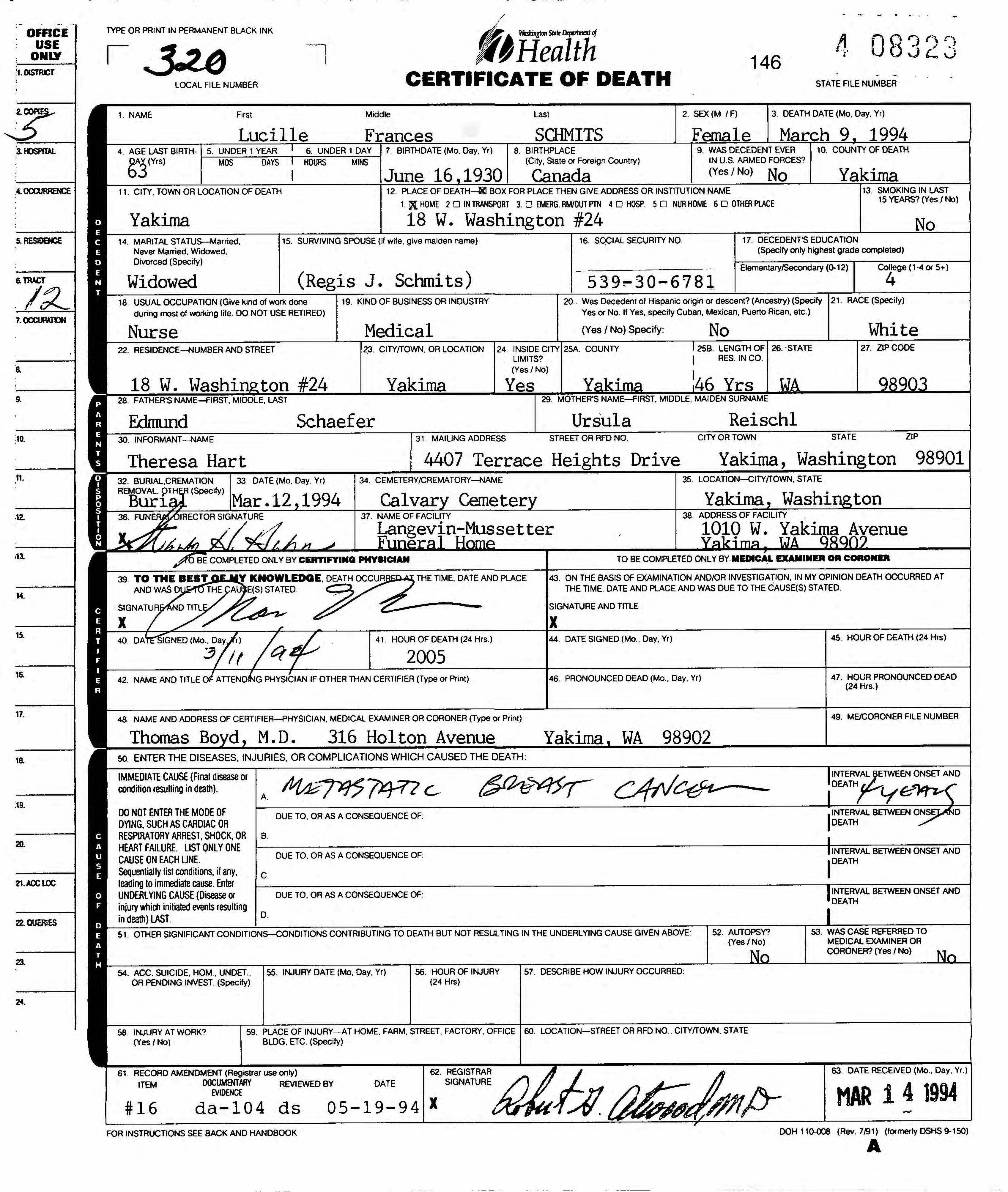 | Died: | March 9, 1994 in Yakima, Yakima Co, WA. |