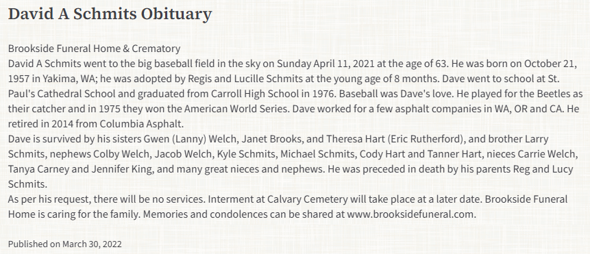 | Died: | April 11, 2021 in Yakima County, WA. |