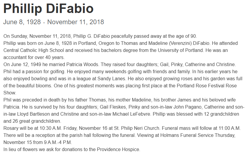 Patricia married Phillip Gabriel DiFabio on June 12, 1949 in Portland, Multnomah Co, OR.
