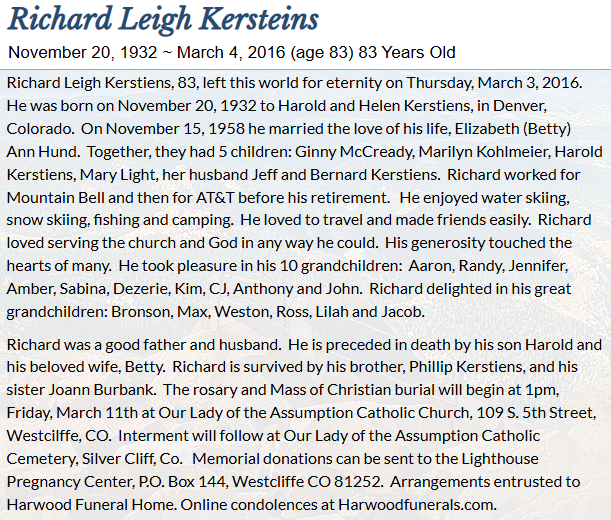 - 1950 Census - Denver, Denver Co, CO (Listed as Richard, age 17, son of Harold A. Kerstiens)