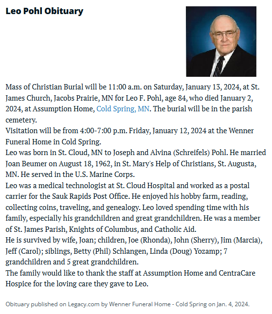 Died: | January 2, 2024 in Cold Spring, Stearns Co, MN. View Obituary |