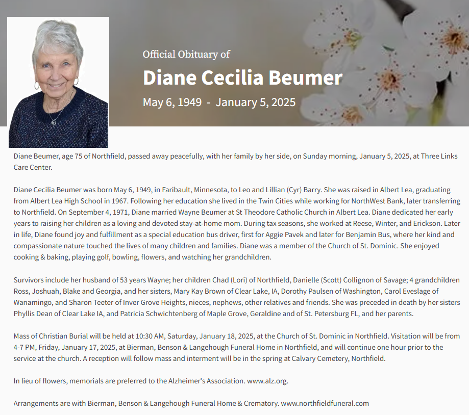 Died: | January 5, 2025 in Northfield, Rice Co, MN. View Obituary |