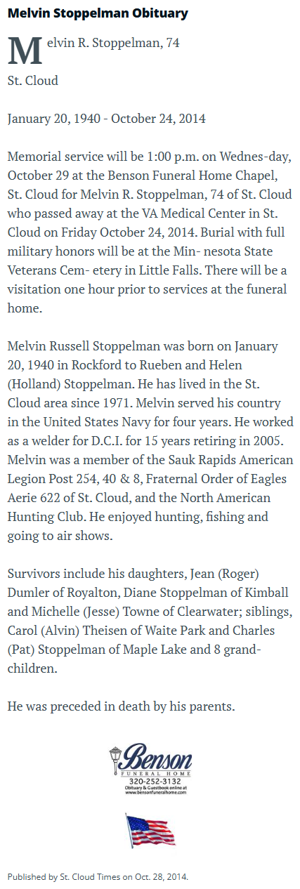 | Died: | October 24, 2014 in St. Cloud, Stearns Co, MN. View Obituary |