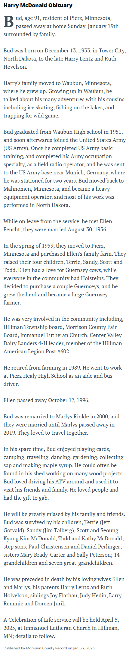 | Died: | January 19, 2025 in Pierz, Morrison Co, MN. View Obituary |