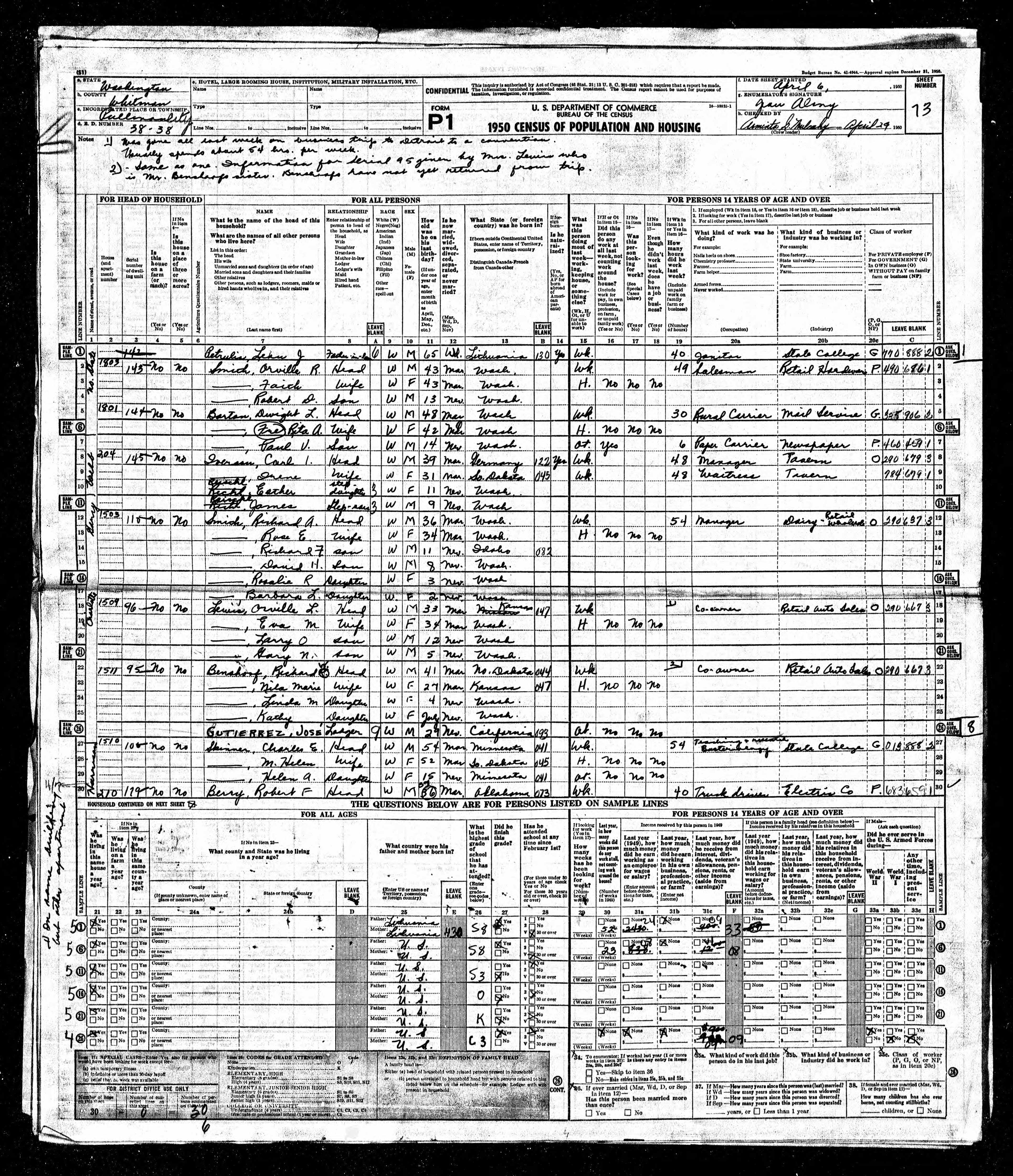 - 1950 Census - Pullman, Whitman Co, WA (Listed as James, age 9, step-son of Carl L. Iverson)