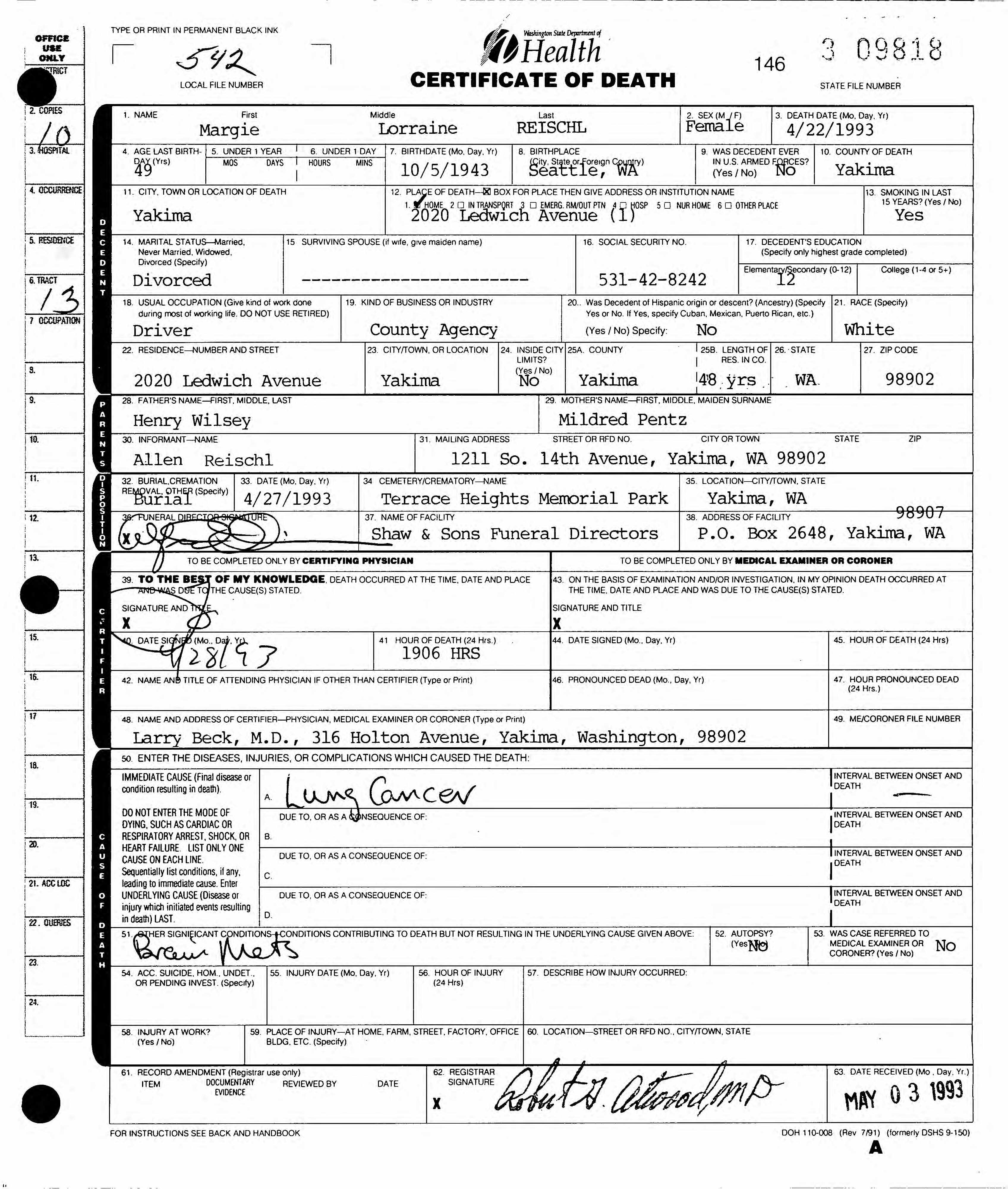 | Died: | April 22, 1993 in Yakima, Yakima Co, WA. |