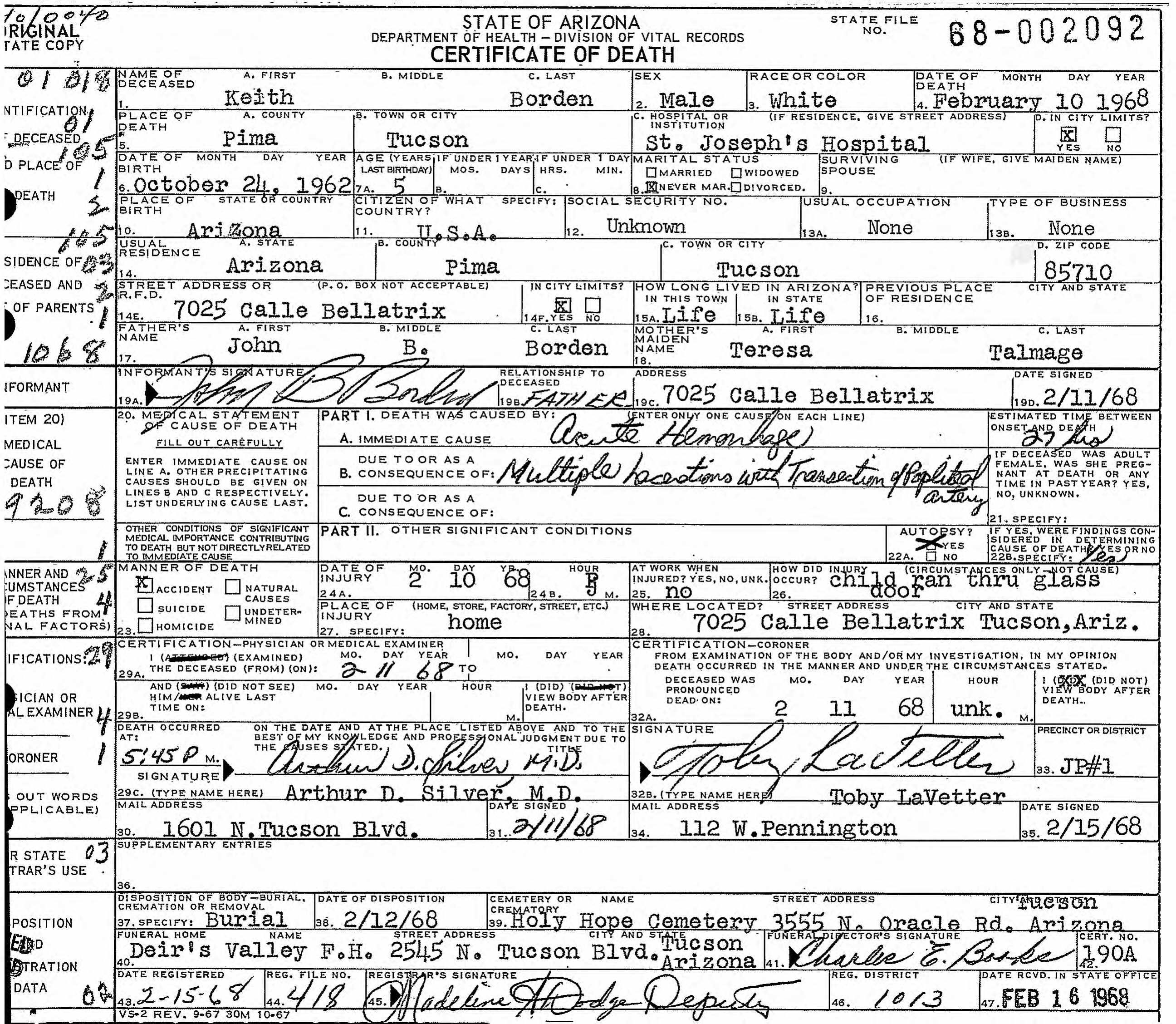- Death Certificate - Death certificate for Keith