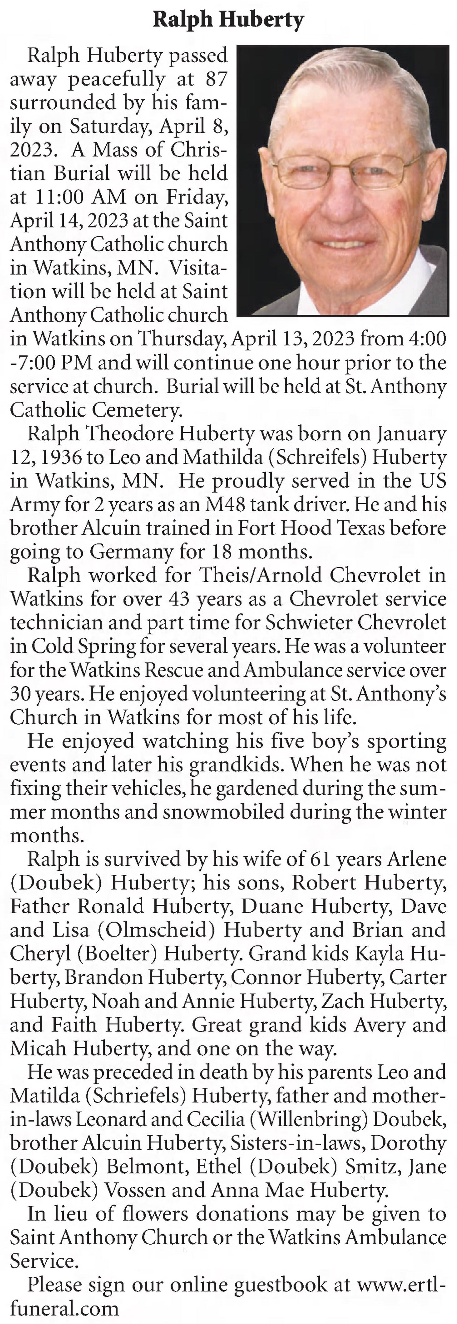 | Born: | January 12, 1936 in Watkins, Meeker Co, MN. |