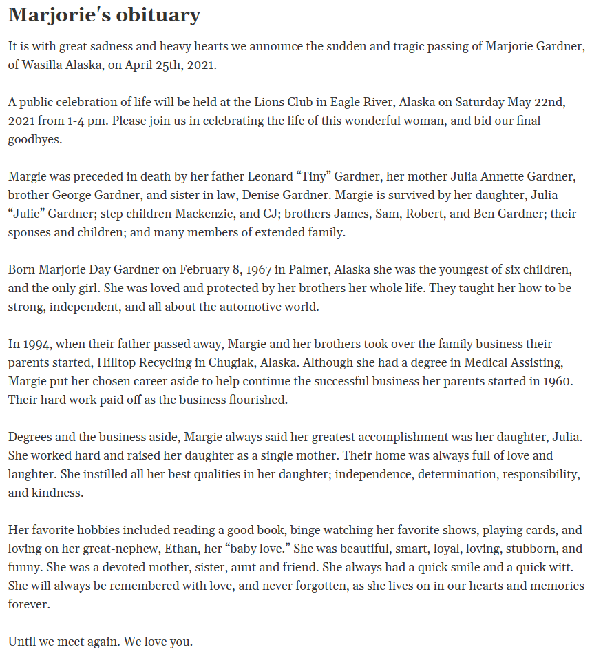 | Died: | April 25, 2021 in Wasilla, Matanuska-Susitna, AK. View Obituary |