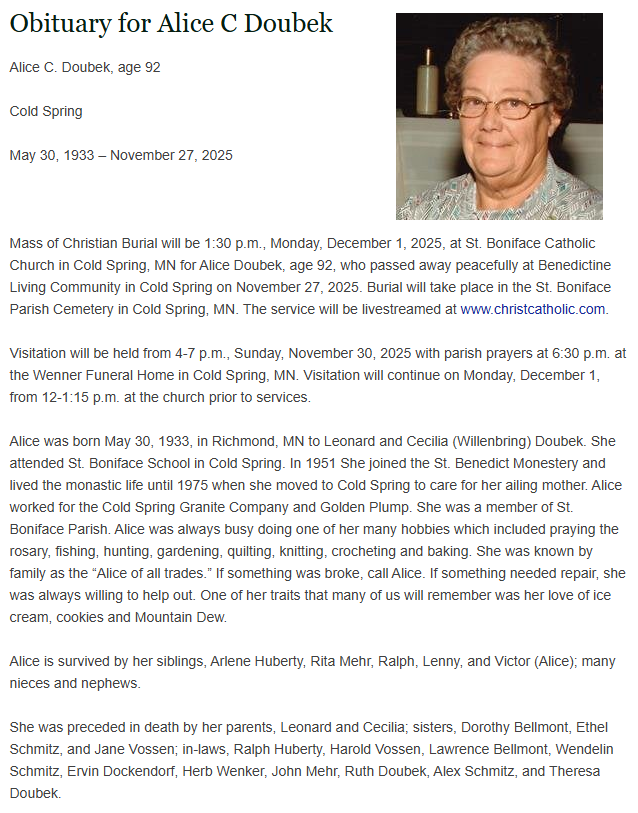 | Died: | November 27, 2025 in Cold Spring, Stearns Co, MN. View Obituary |
