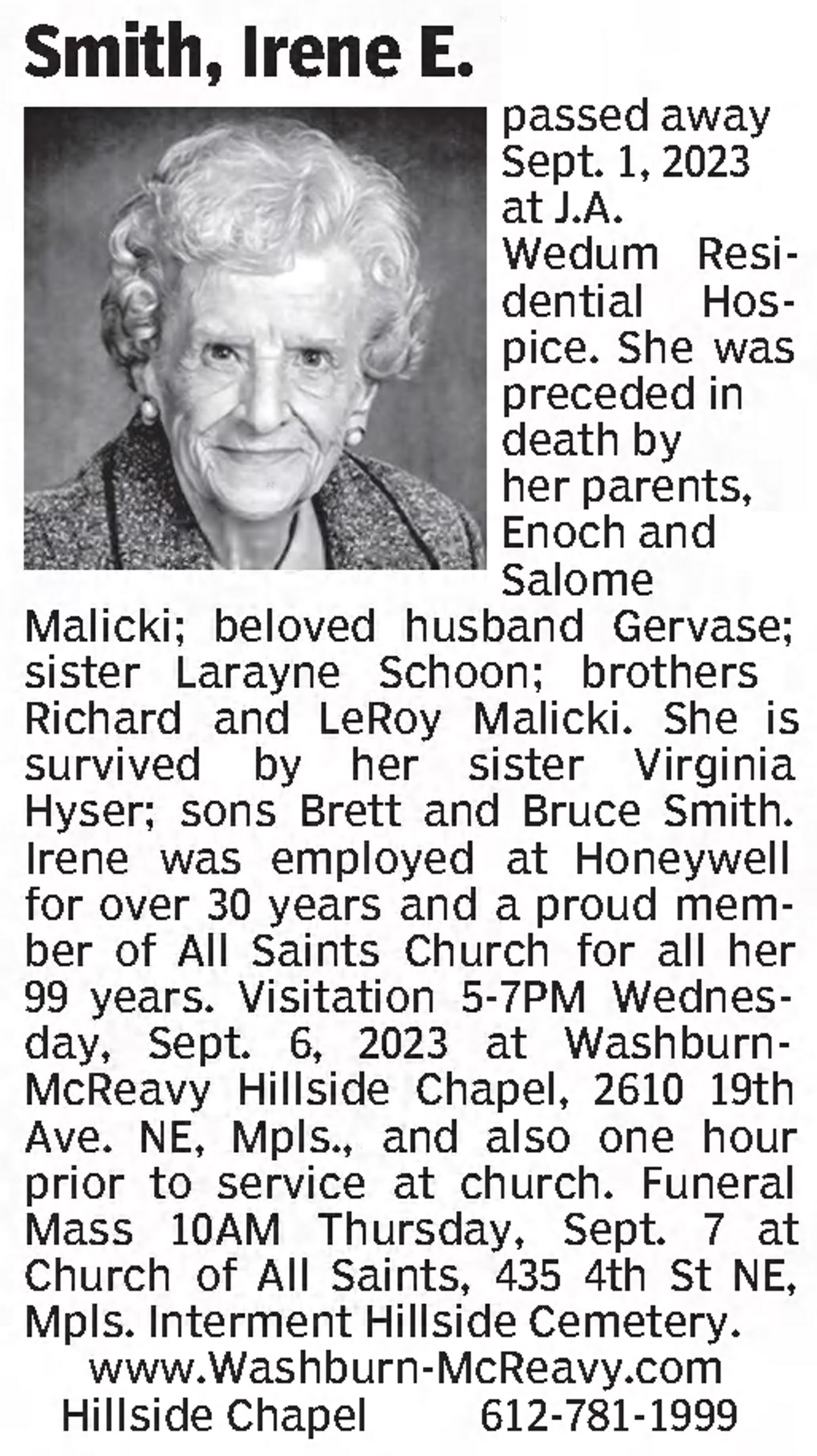 - 1940 Census - Minneapolis, Hennepin Co, MN (Listed as Irene, age 16, daughter of E. H. Malicki)