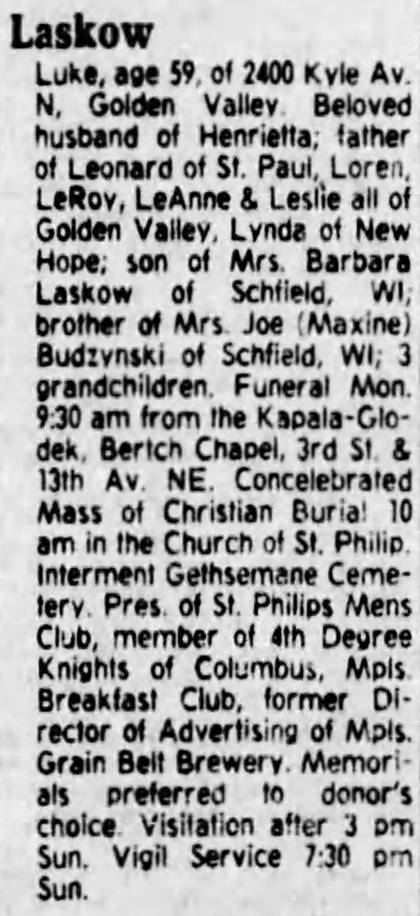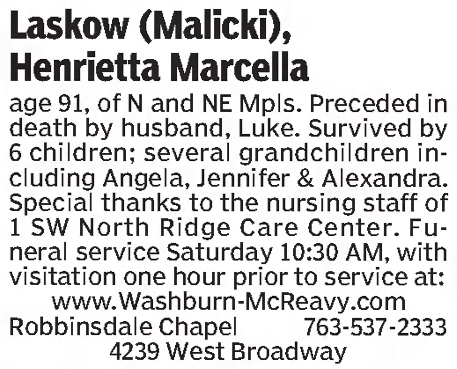 - 1950 Census - Minneapolis, Hennepin Co, MN (Listed as Henrietta, age 28, wife of Lucian Laskowski)