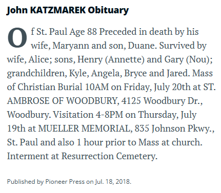 Parents: | John Edward Katzmarek and Mary Harriet Bartylla |