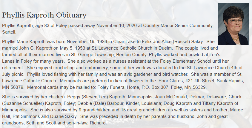 Died: | November 10, 2020 in Sartell, Benton Co, MN. View Obituary |