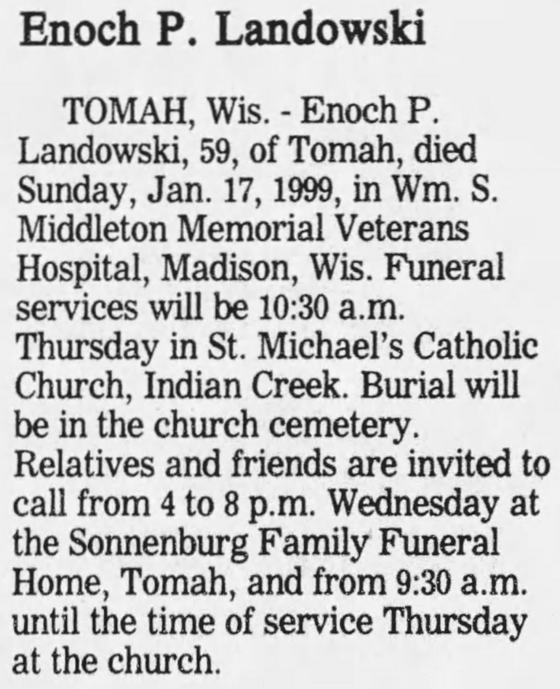 - 1950 Census - Haven Township, Sherburne Co, MN (Listed as Enoch, age 9, son of Theodore M. Landowski)