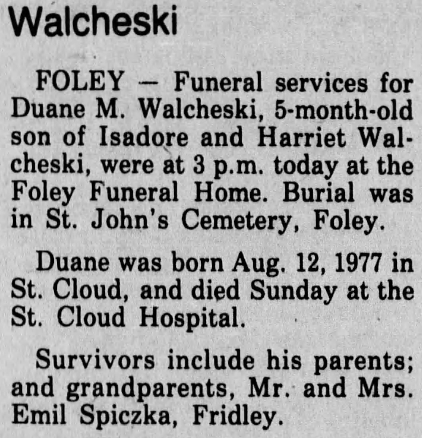 Buried: | Saint Johns Catholic Cemetery, Foley, Benton Co, MN. |