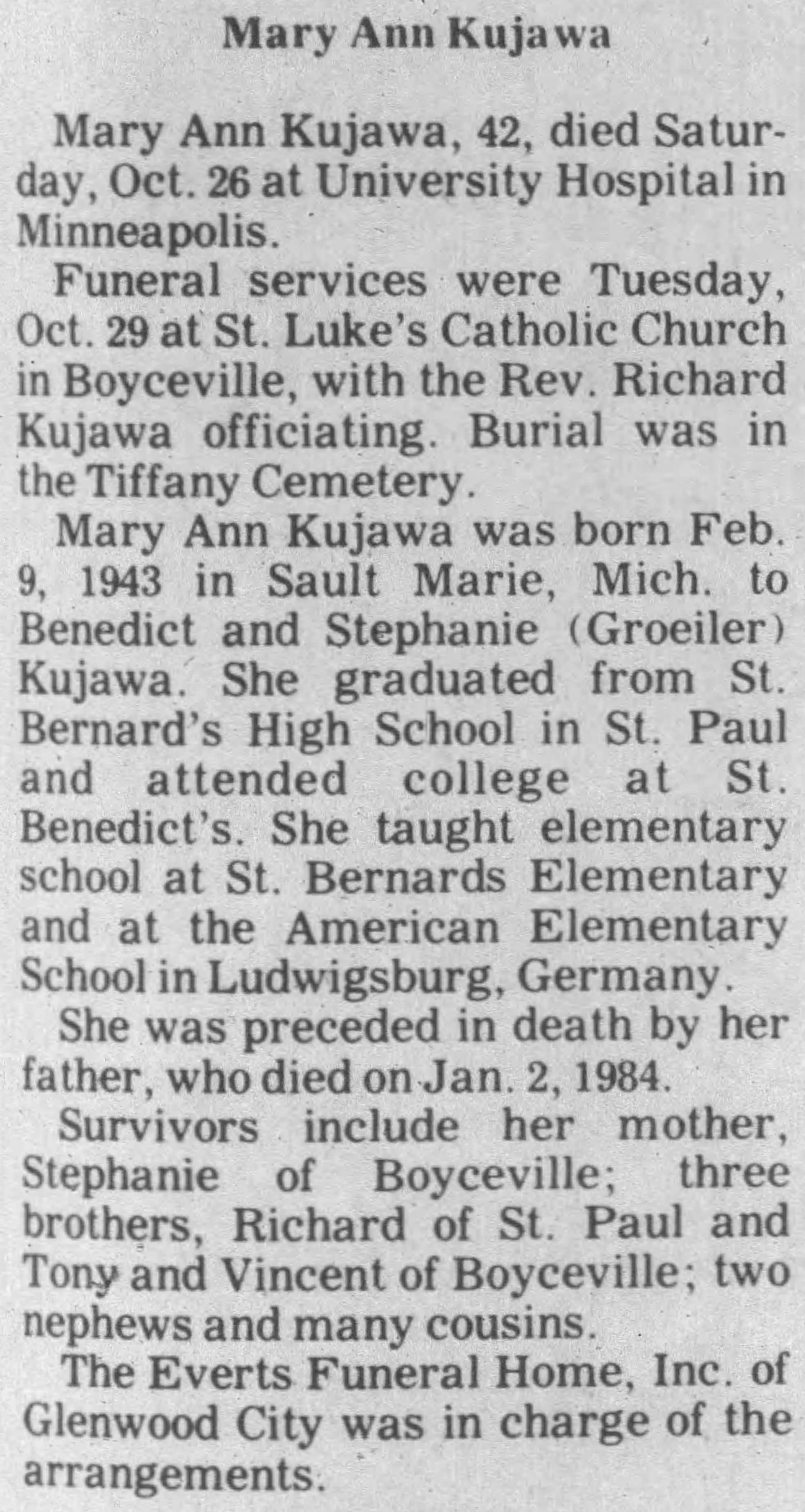 Parents: | Benedict Vincent Kujawa and Stephanie Julia Groeler |