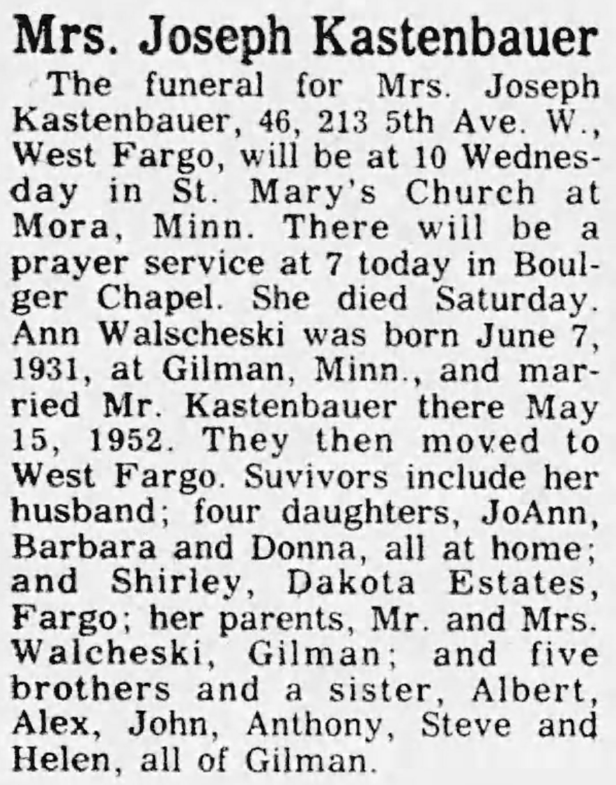 Ann married Joseph William Kastenbauer on May 15, 1951 in Gilman, Benton Co, MN.