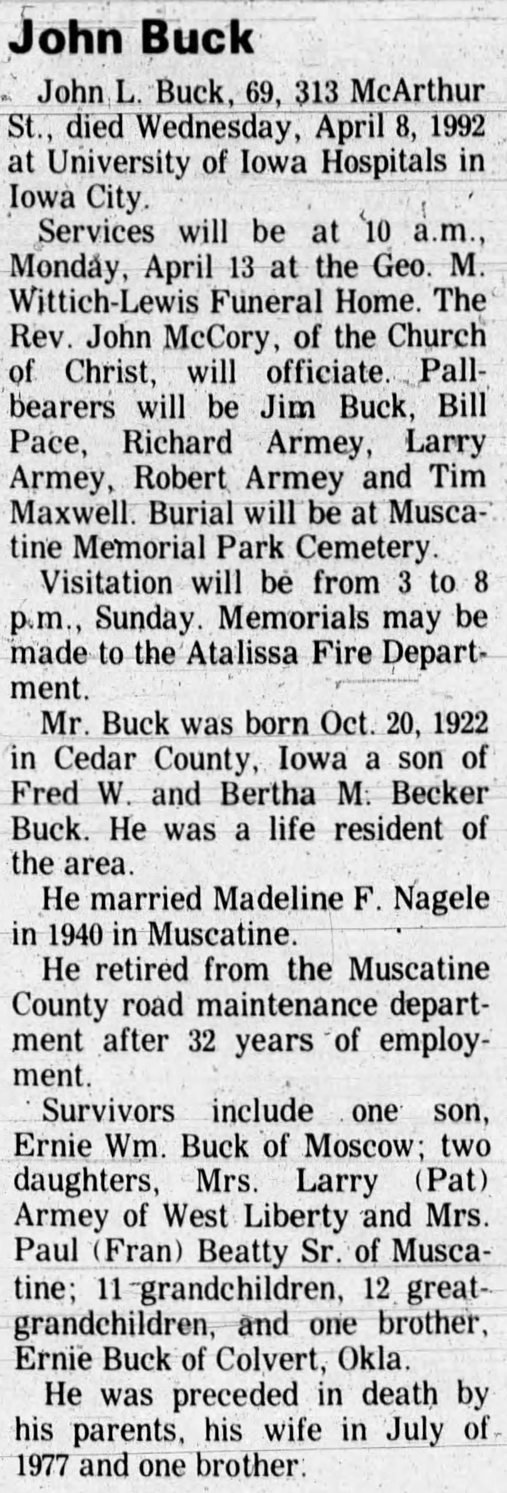 Madeline married John Lee Buck on April 18, 1940 in Tipton, Cedar Co, IA.