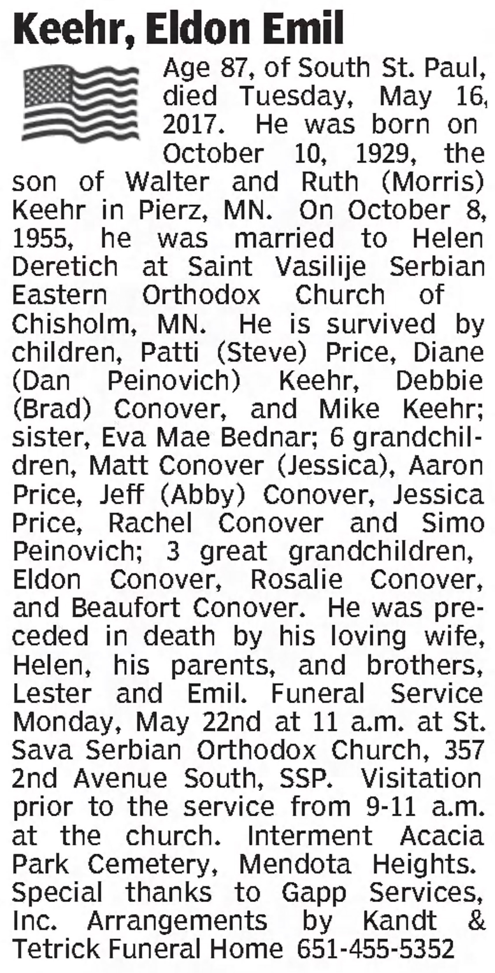 Eldon married Helen Beryl Deretich on October 8, 1955 in Chisholm, St. Louis Co, MN.