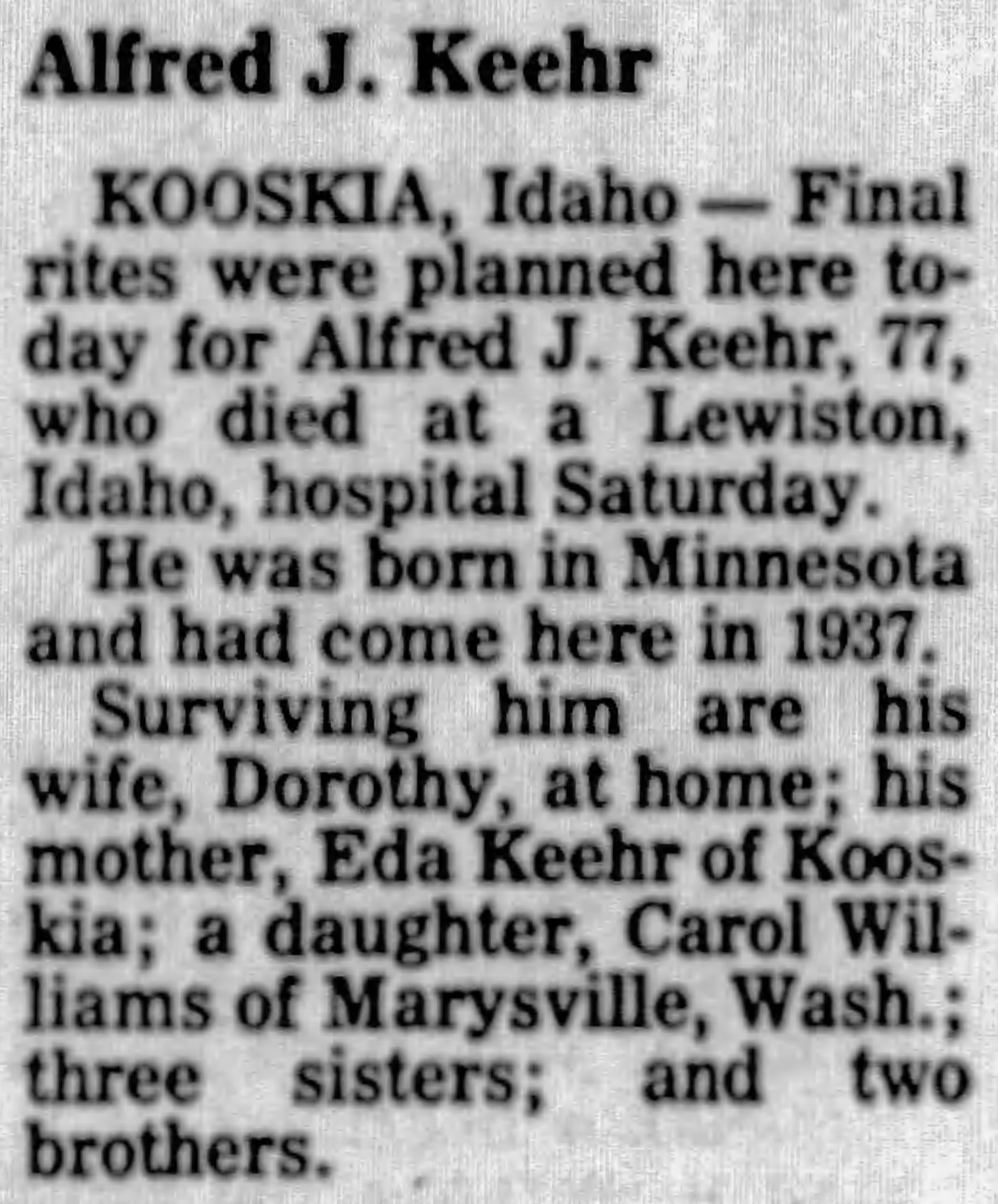 - 1950 Census - Kooskia, Idaho Co, ID (Listed as Alfred J. Keehr, age 47, head of household)