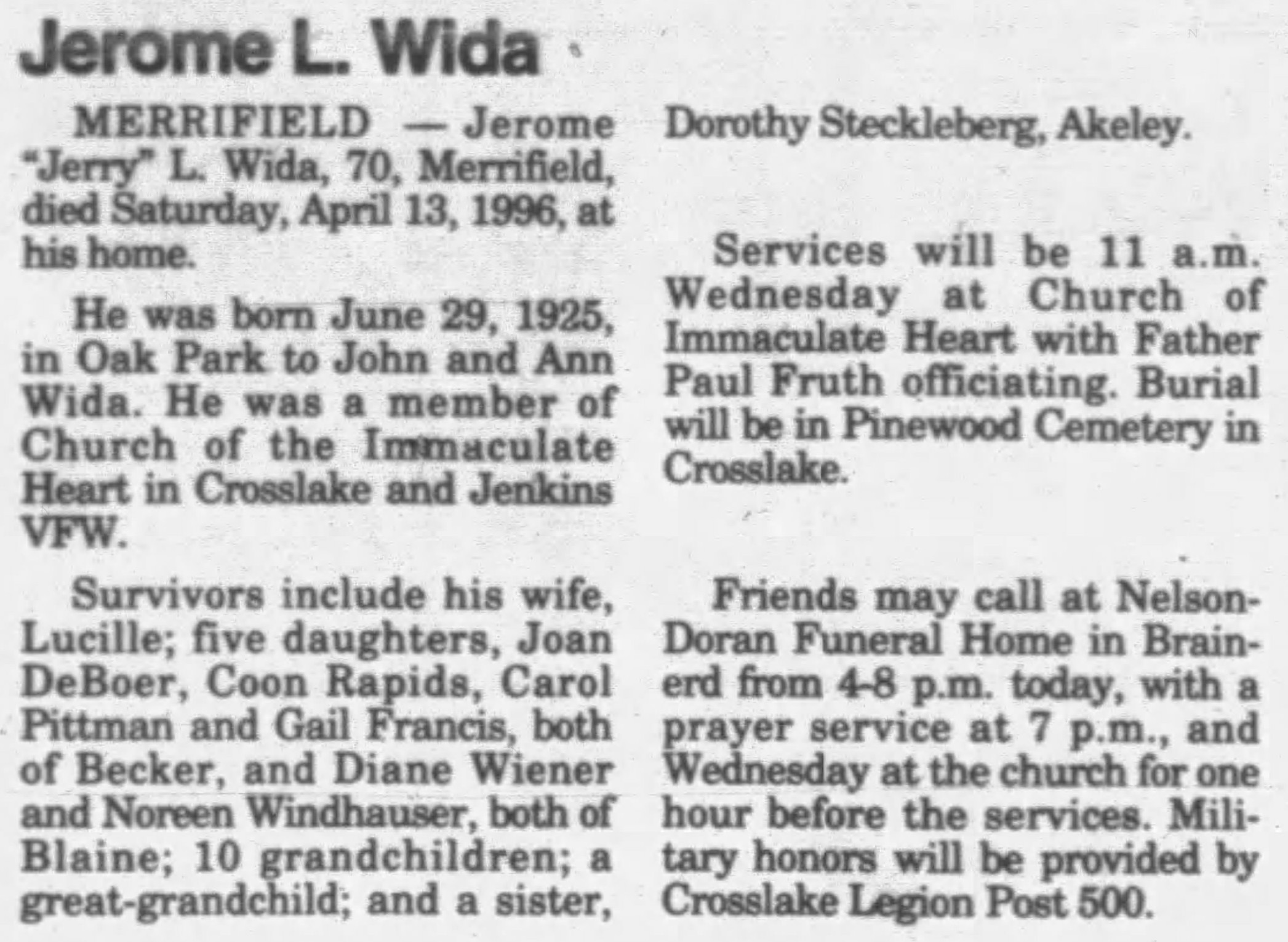 | Died: | April 13, 1996 in Merrifield, Crow Wing Co, MN. View Obituary |