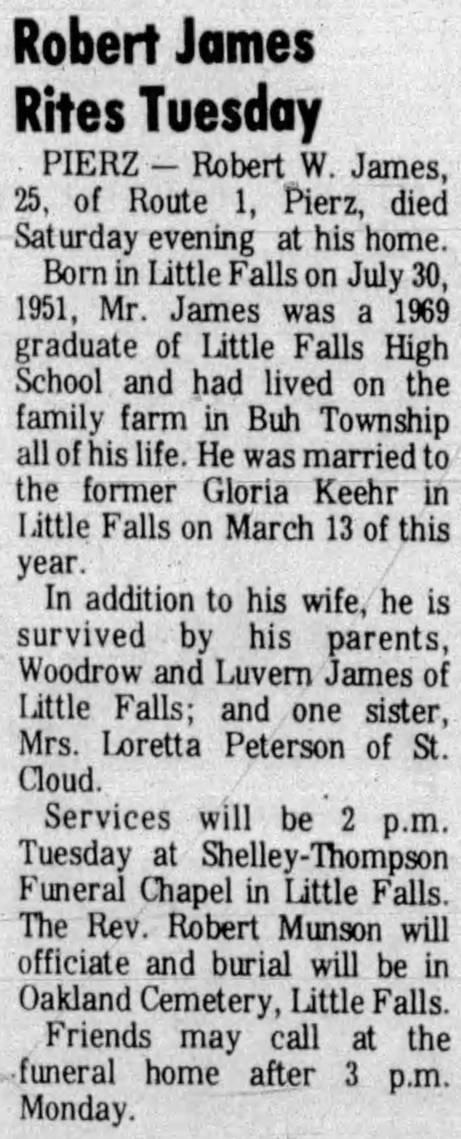 | Buried: | Oakland Cemetery, Little Falls, Morrison Co, MN. |