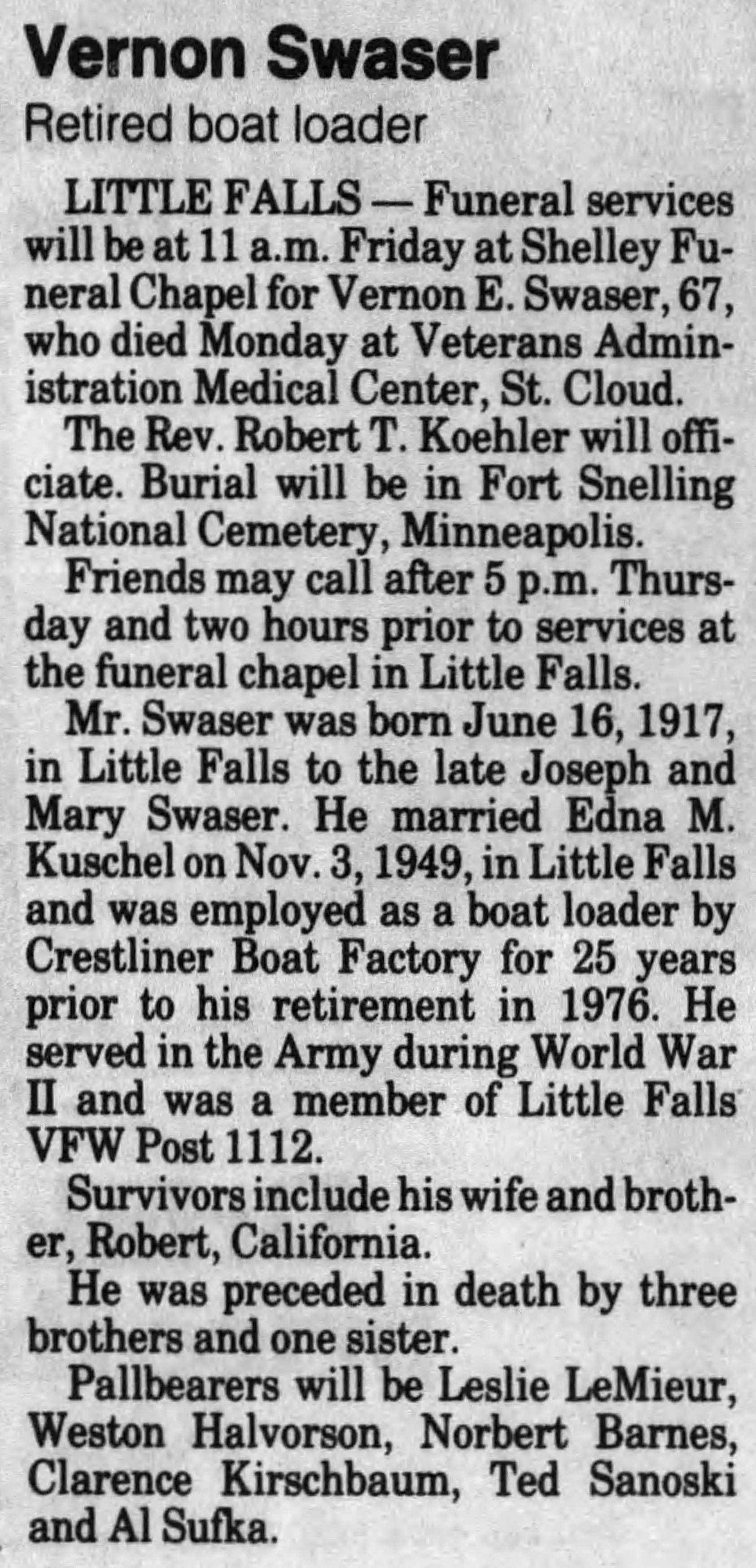 Edna married Vernon E. Swaser on November 3, 1949 in Little Falls, Morrison Co, MN.