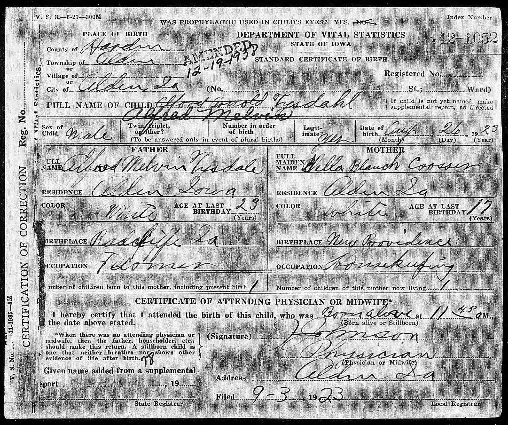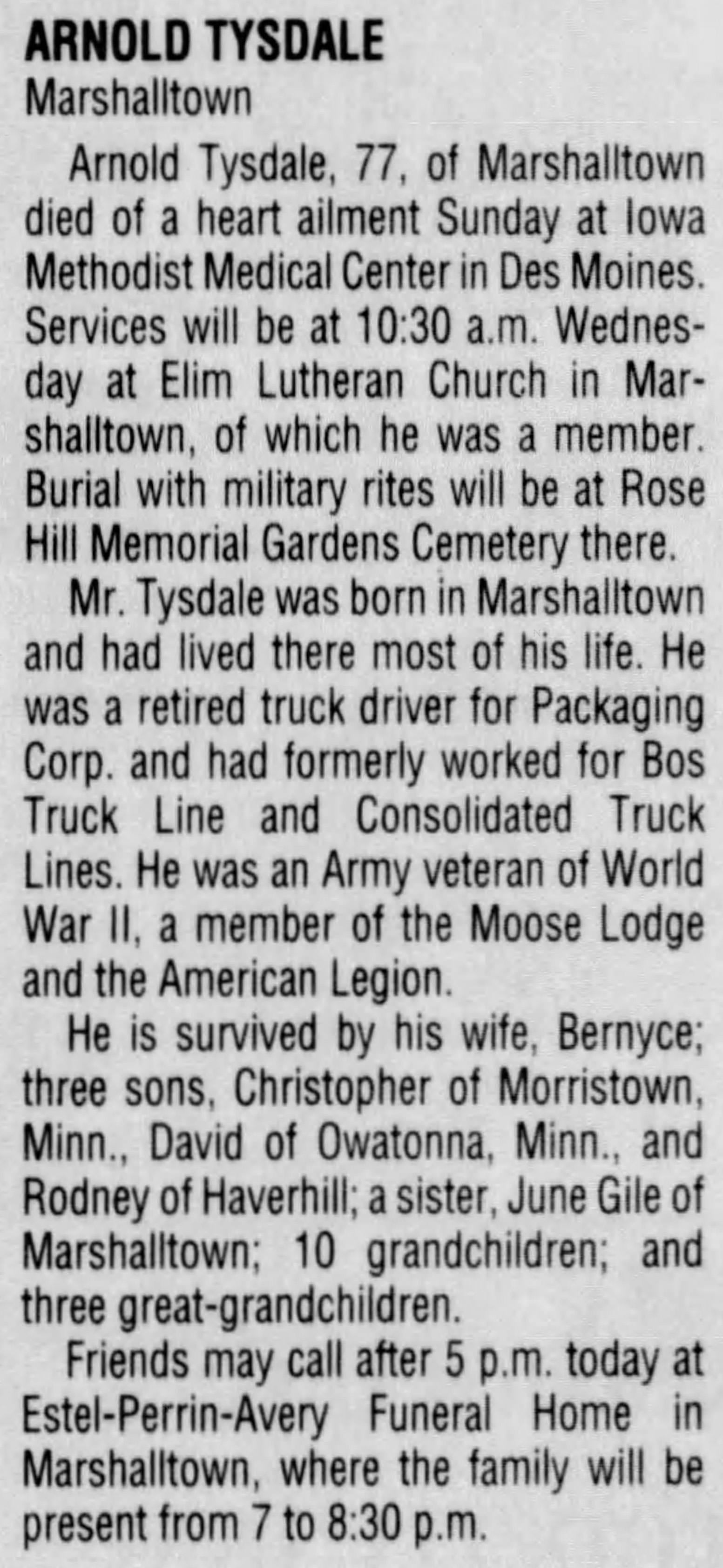 Ione married Alfred Arnold Tysdale on June 21, 1946 in Marshalltown, Marshall Co, IA.