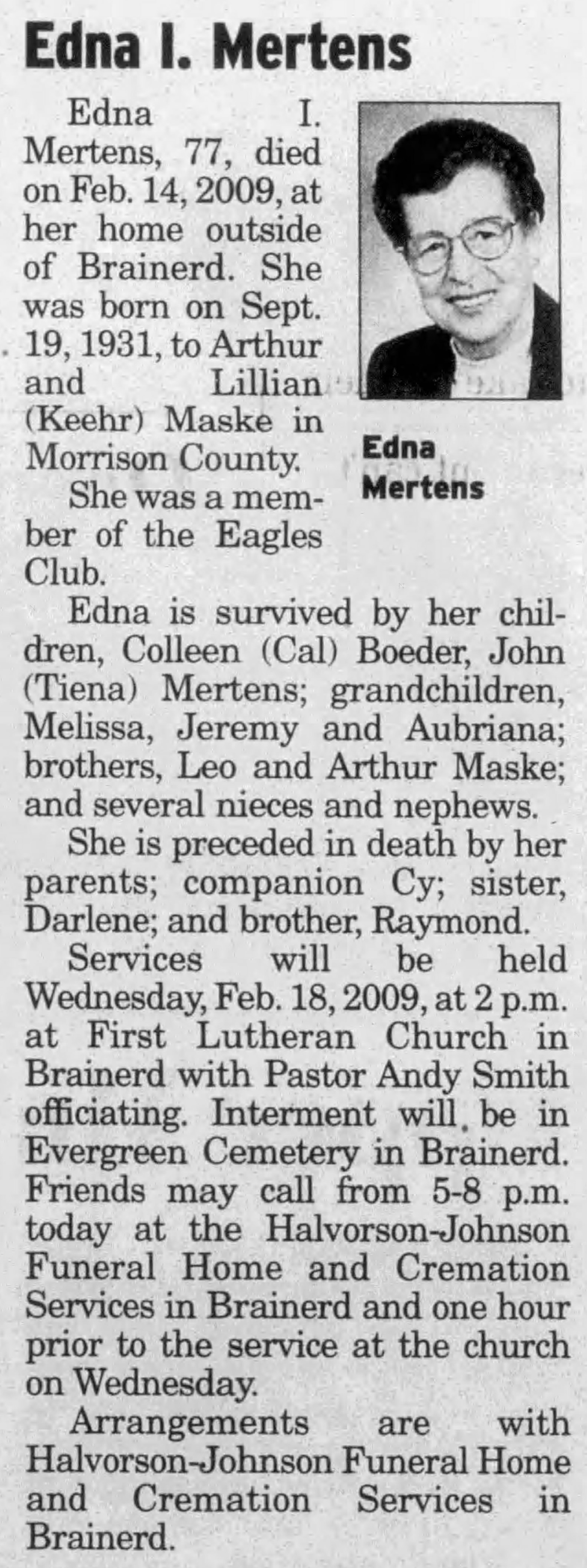 - 1940 Census - Brainerd, Crow Wing Co, MN (Listed as Edna, age 7, daughter of Lillian Maske)