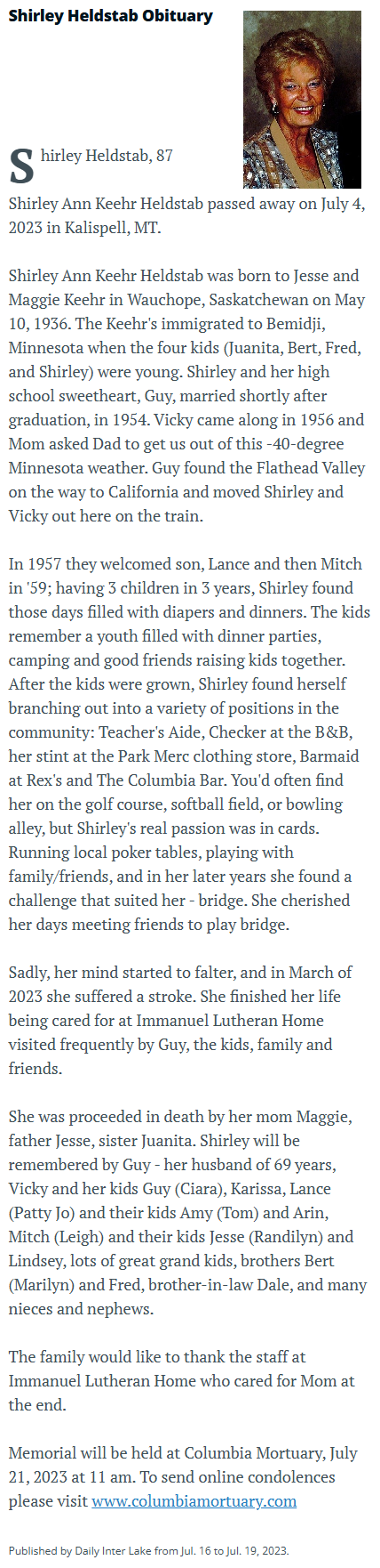 | Died: | July 4, 2023 in Kalispell, Flathead Co, MT. View Obituary |