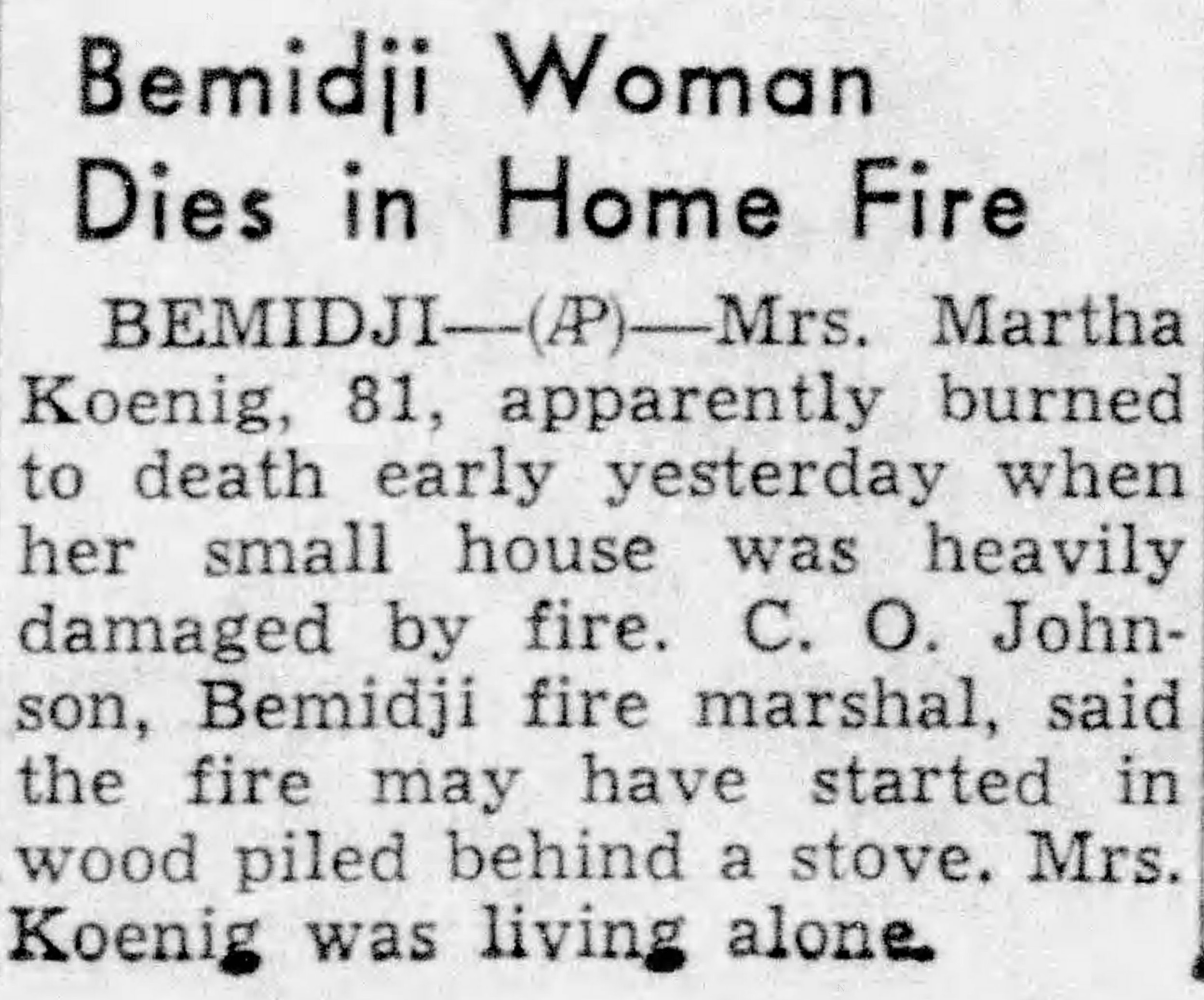 - 1940 Census - Rockwood Township, Hubbard Co, MN (Listed as Martha C. Koenig, age 73, head of household)