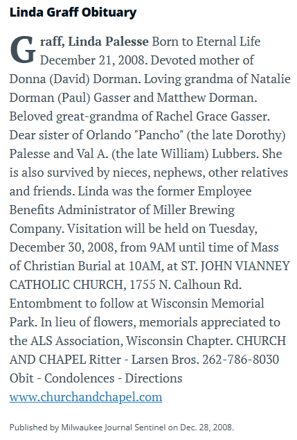 | Died: | December 21, 2008 in Waukesha County, WI. View Obituary |