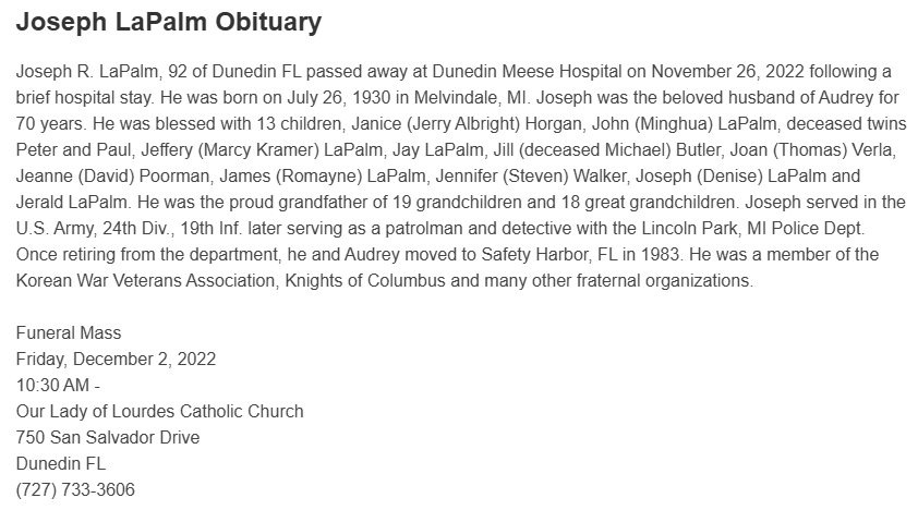 | Died: | November 26, 2022 in Dunedin, Pinellas Co, FL. View Obituary |