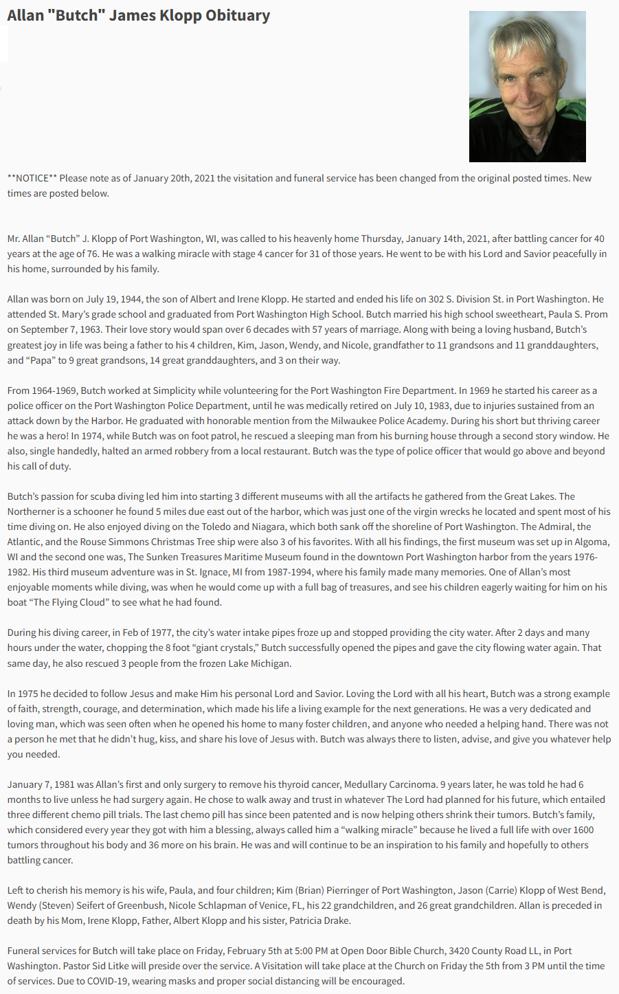 | Died: | January 14, 2021 in Port Washington, Ozaukee Co, WI. View Obituary |