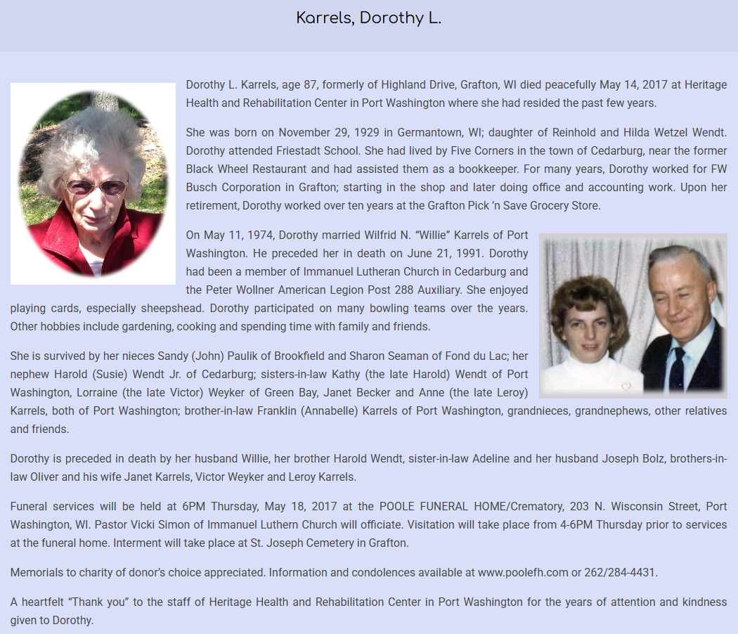 Wilfred married Dorothy L. Wendt on May 11, 1974 in Port Washington, Ozaukee Co, WI.