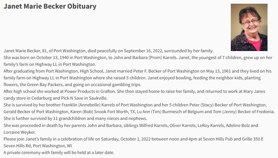 Janet married Peter Francis Becker on May 13, 1961 in Belgium, Ozaukee Co, WI.