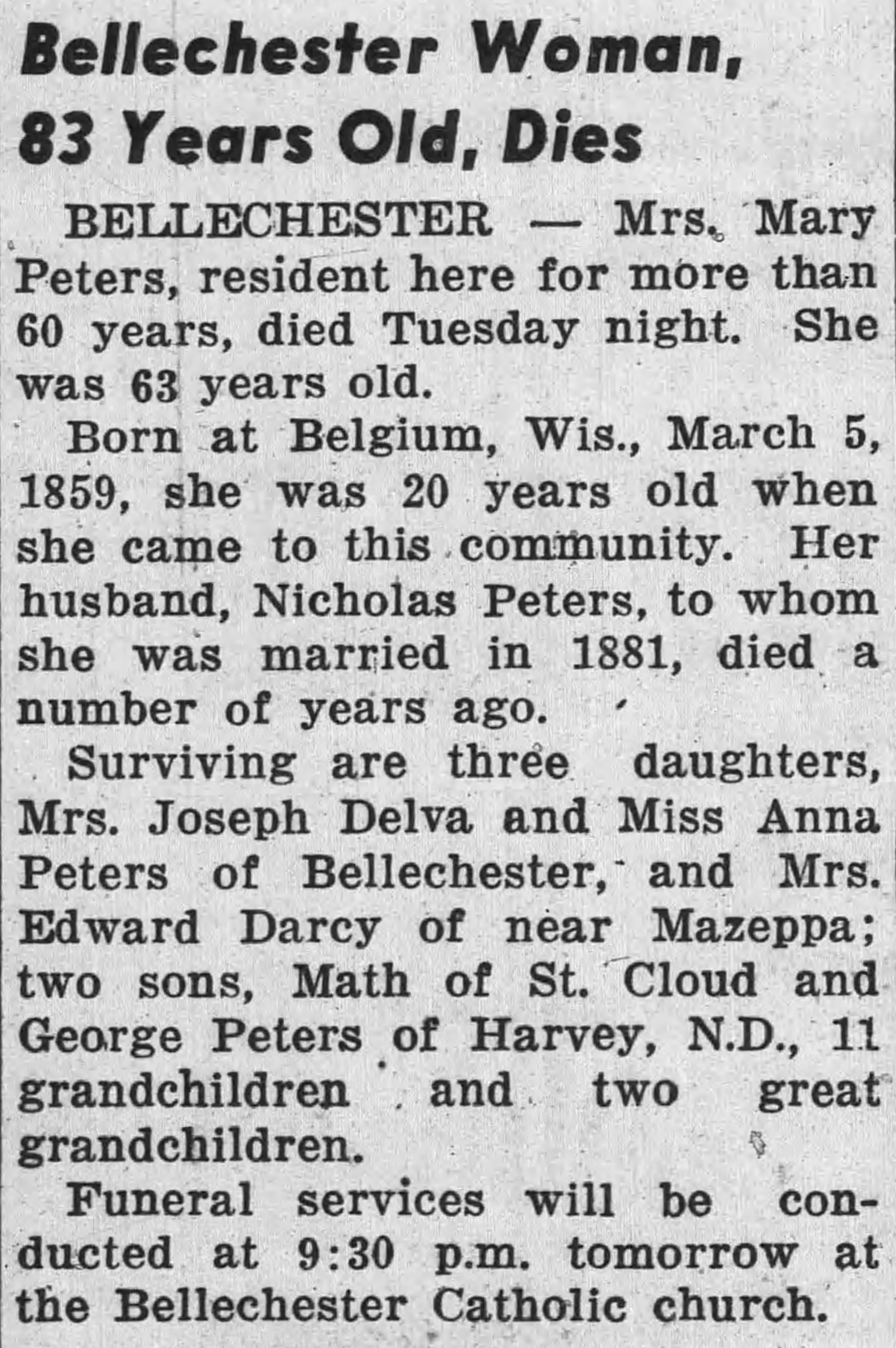 Mary married Nicholas Peters on May 24, 1881 in Bellechester, Goodhue Co, MN.