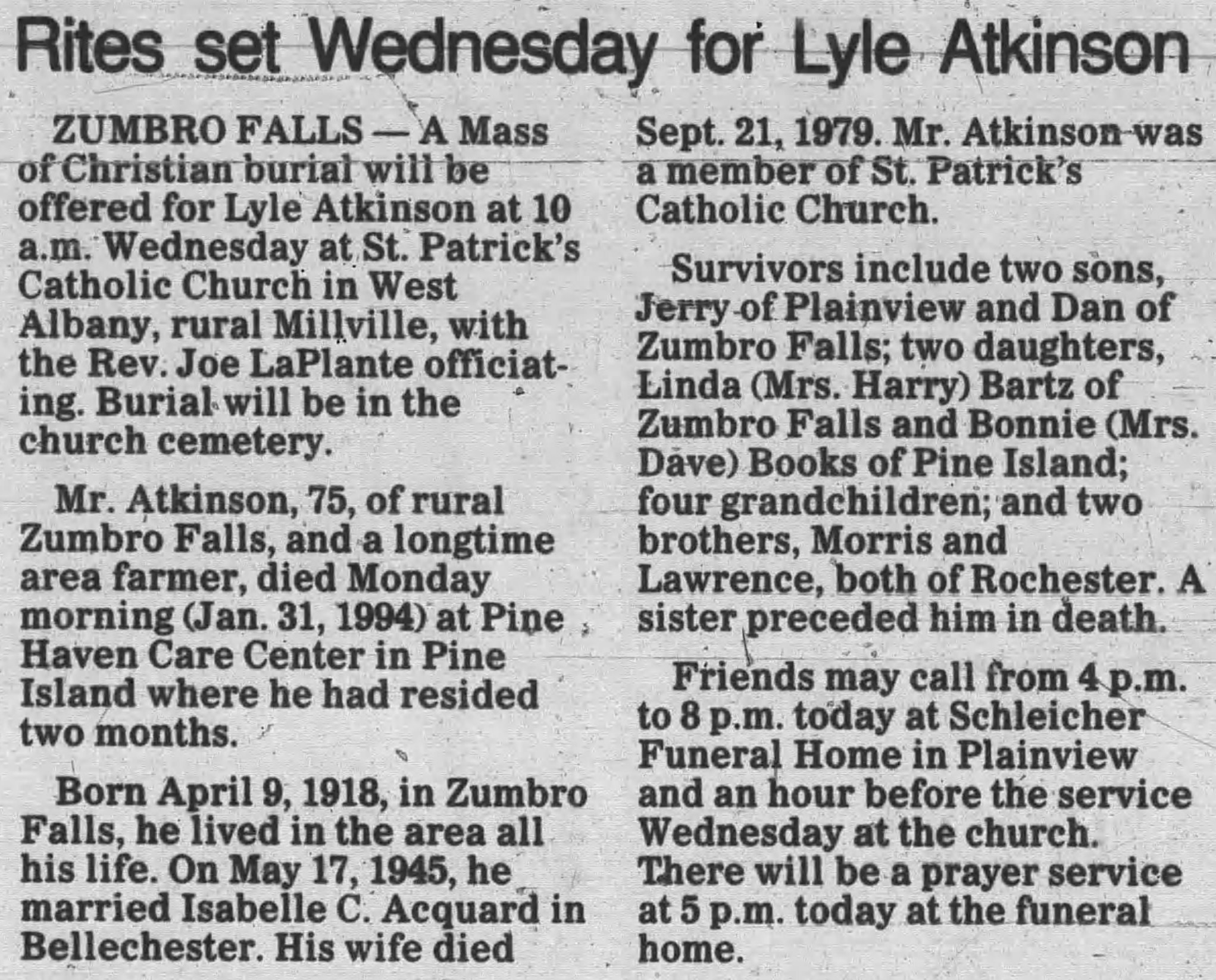 | Died: | January 31, 1994 in Pine Island, Goodhue Co, MN. View Obituary |