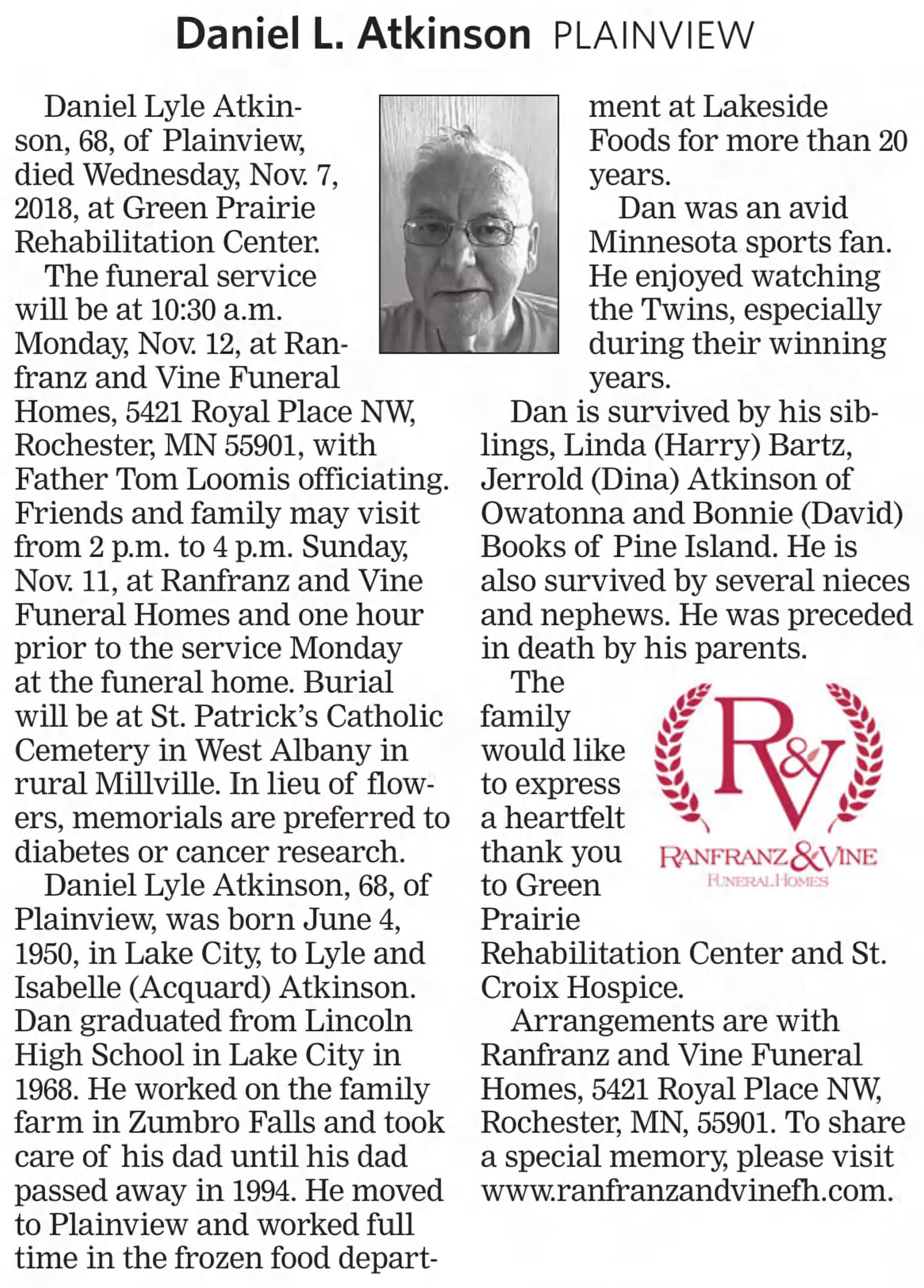 | Died: | November 7, 2018 in Plainview, Wabasha Co, MN. View Obituary |